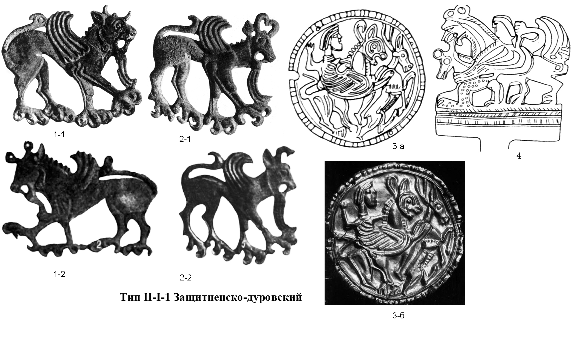 Тип II-I-1 Защитненско-дуровский объединяет 4 изображения, происходящие с территории Среднего Поднепровья (1, 2), Среднего Подонья (3) и Нижнего Поднепровья (4)[69]. Изображение моделировано в одностороннем рельефе - на плоскости (3) или с прорезями (1, 2) либо же в двустороннем рельефе с прорезями, но в расчете на боковой обзор (4). Это фигуры, оформляющие бронзовые бляхи (1, 2), бронзовое навершие (4), а также фигура, помещенная на золотую пластину (3). Здесь изображено существо с туловищем и ногами хищника, с головой кошачьего хищника (короткая тупомордая), с крыльями, с бычьими (1) или козлиными (2-1, 2-2, 3, 4) рогами. Рога в защитненских изображениях помещены на темени перед ухом, развернуты на зрителя и представляют собой, в одном случае, отчётливые подковообразные рога быка, моделированные короткими серповидными выступами (1-1), которые могут на концах загибаться в кружки (1-2); в другом случае рога аналогичной формы, но сильно согнуты вовнутрь и сомкнуты окончаниями (2-1). В дуровском и слоновском изображениях показан один рог, он помещен за ухом, он короткий изогнутый, скорее, козлиный (3, 4). В защитненских изображениях к подбородку примыкает серповидная борода, имеющая крупное продольное рифление, ее окончание упирается в переднюю лапу. Таким образом, перед нами монстры, соответствующие скорее иконографии грифона ахеменидского типа, хотя, возможно, в сочетании с чертами грифона позднегреческого типа (если трактовать рельефную полосу вдоль верхнего края шеи не как шерсть, а как гребень рептилии) (рис. 12).