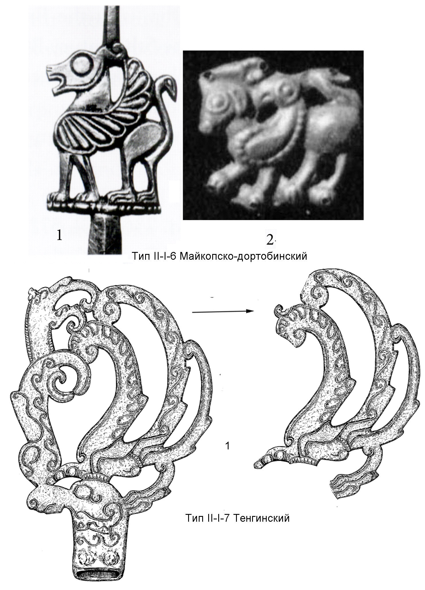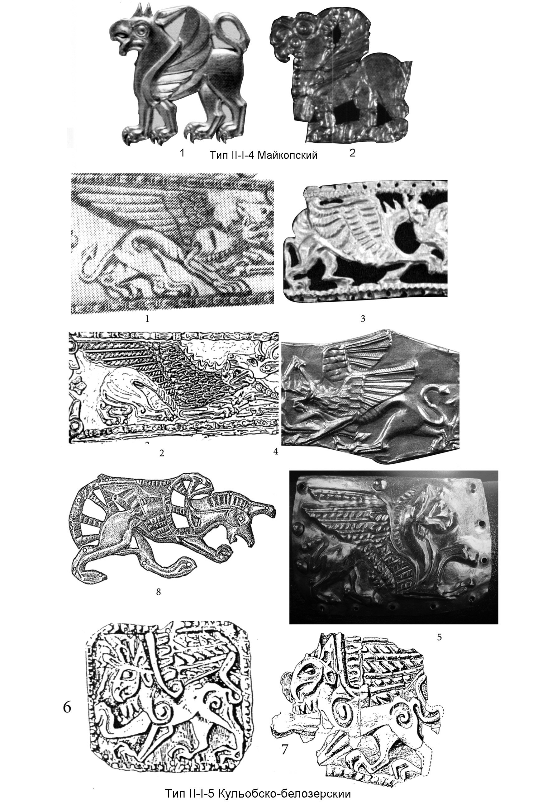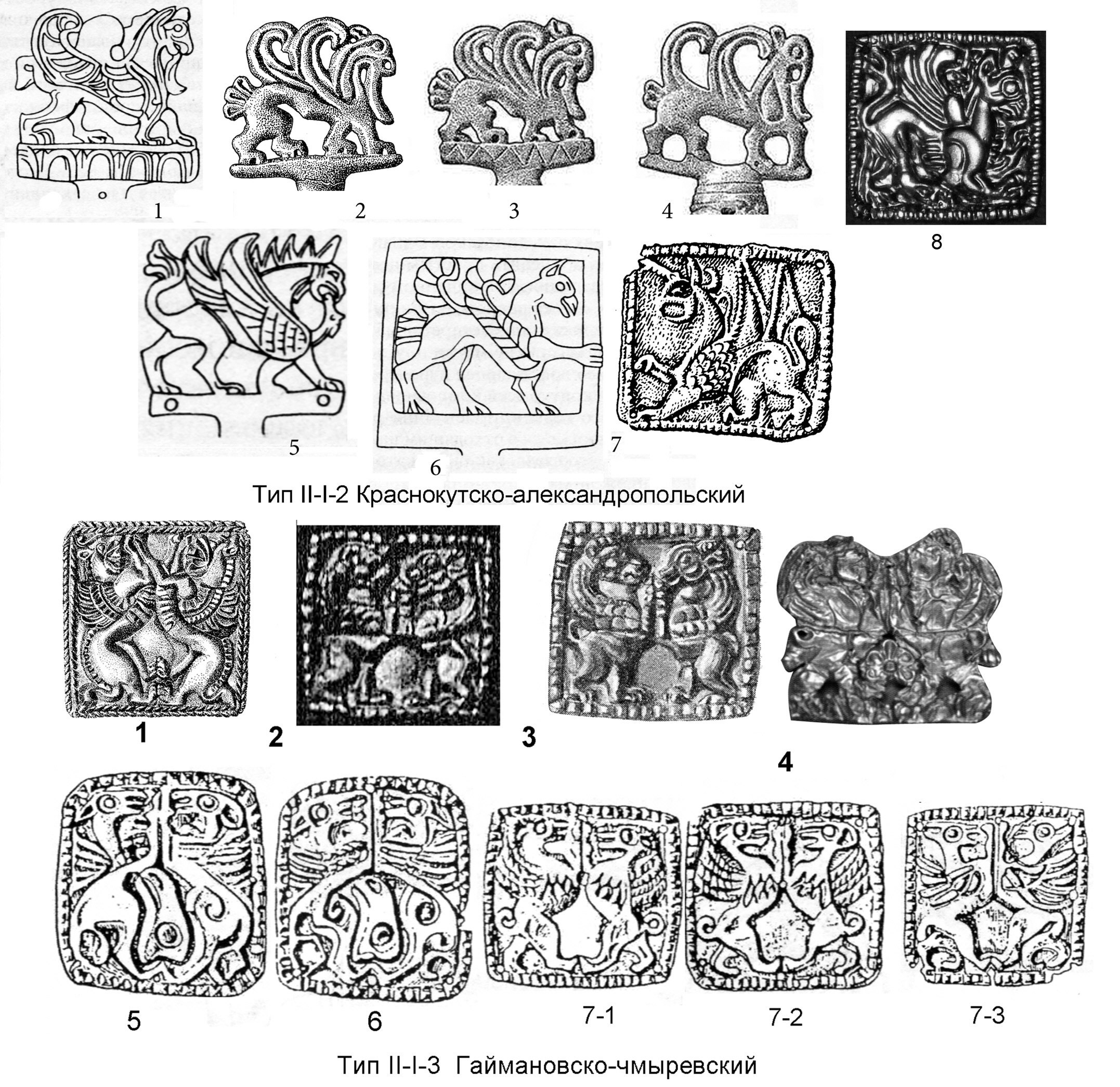 1 - Краснокутский курган (по: Мелюкова А.И. Краснокутский курган. М., 1981. Рис.10: 1, 2); 2 – Гайманова могила, Центральная гробница (по: Бидзиля В.И., Полин С.В. Скифский царский курган Гайманова Могила. Кат. 88, рис. 92: 2); 3, 4 Толстая могила (по: Мозолевський Б.М. Товста Могила. Киiв, 1979. Кат.149, рис.103: 1-3); 5 Догмаровка, находка у насыпи кургана (по: Клочко Л.С., Оленковский Н.П. Новые скифские навершия с Нижнего Днепра // Советская археология. № 3. 1990. Рис.1); 6 - Александропольский курган (по: Древности Геродотовой Скифии. Сборник описаний археологических раскопок и находок в Черноморских степях. Вып. I. СПб, 1866. Табл. III, 1-4; IV, 1-4); 7 – Желтокаменка (по: Мозолевский Б.Н. Скифский царский курган Желтокаменка. Рис.37: 23); 8 - Братолюбовский курган, погребение 5 (по: Кубышев А.И., Бессонова С.С., Ковалев Н.В. Братолюбовский курган. Киев, 2009. Фото 27). Тип II-I-3 Гаймановско-чмыревский: 1 - Гайманова могила, Северная гробница (по: Бидзиля В.И., Полин С.В. Скифский царский курган Гайманова Могила. Кат.166, рис.104:1). 2 - Верхний Рогачик (по: Отчет Императорской археологической комиссии за 1913-1915 гг. Пг. 1918. С. 135, рис. 221); 3 Чмырева могила (по: Отчет Императорской археологической комиссии за 1898 г. СПб, 1901. С. 27, рис.25); 4 - Майкопский клад (по: Leskov А.М. Op. cit. Cat. № 60); 5 - Мастюгино, курган 5 1908 г. раскопки Н.Е. Макаренко (по:. Макаренко Н.Е. Археологические исследования 1907-1909 годов // Известия Императорской археологической комиссии. Вып.43. СПб., 1911. Таб. I, 14); 6 - Мастюгино, на практически тождественных семи идентичных бляшках, собранных А.А. Спицыным из грабительских раскопок кургана в 1905 г. (по: Отчет Императорской археологической комиссии за 1905 г. СПб., 1908. С.82-83, 96. Рис.119: 8); 7-1, 7-2, 7-3 - Воронежские курганы (по: Либеров П.Д. Памятники скифского времени на Среднем Дону // Свод археологических источников. Д1-31. М., 1965. Таб. 33: 4, 5; Гуляев В.И. Указ. соч. Рис.29, первый ряд сверху, первый рисунок справа)