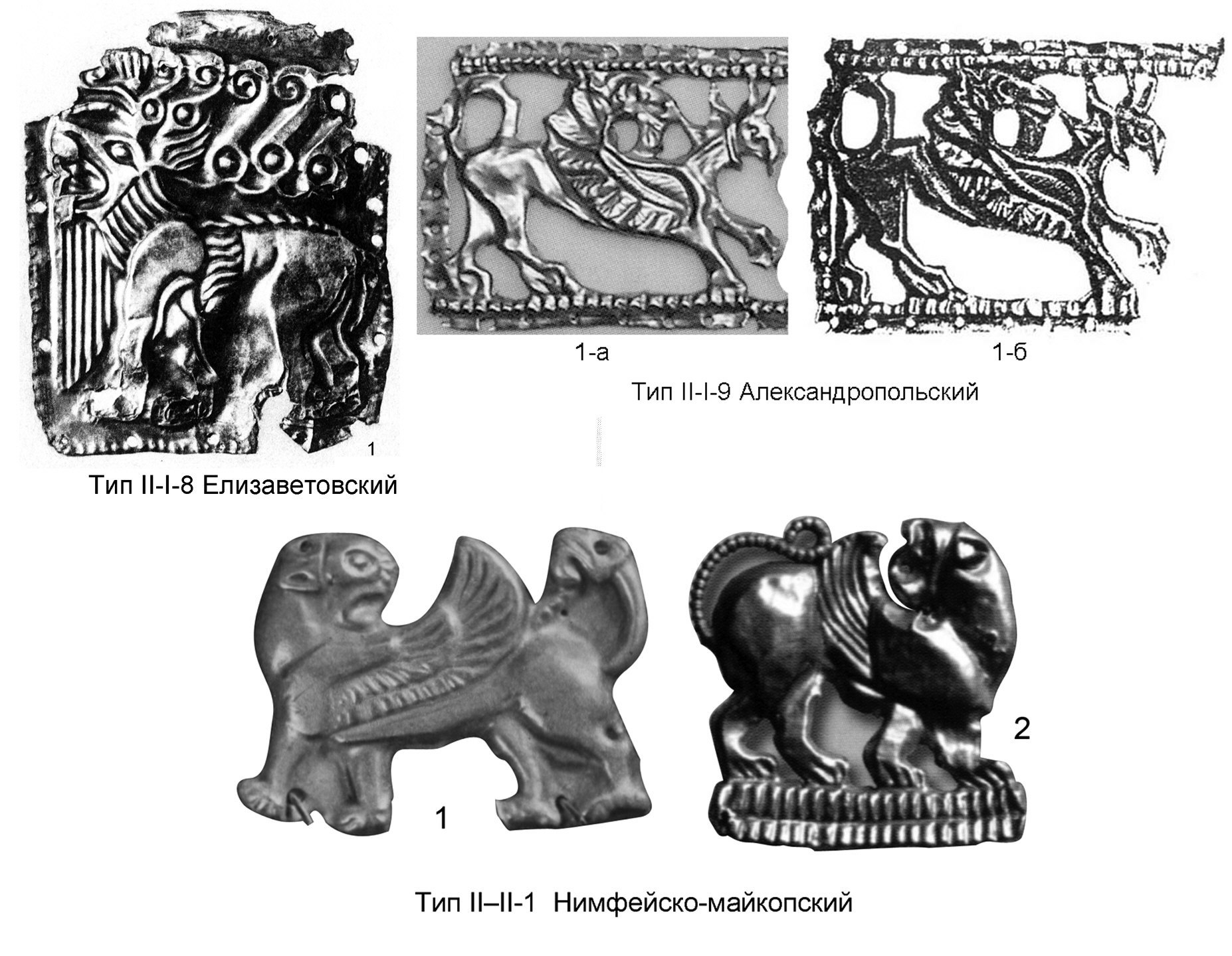 1 - Елизаветовский могильник (по: Borovka G. Scythian Art. L., 1928. Pl.20 B). Тип II–I-9 Александропольский: 1-а, 1-б - Александропольский курган (фото (1-а) по: Алексеев А.Ю. Золото скифских царей в собрании Эрмитажа. СПб., 2012. Илл. на с.252-255, рисунок по: Древности Геродотовой Скифии. Сборник описаний археологических раскопок и находок в Черноморских степях. Вып. I. СПб, 1866. Табл. XV, 1, 4). Тип II–II-1 Нимфейско-майкопский. 1 - Нимфейский могильник, гробница № 17 (по: Артамонов М.И. Сокровища скифских курганов... Табл.101); 2 - Майкопский клад (по: Leskov A.M. Op. cit. Cat. №315)