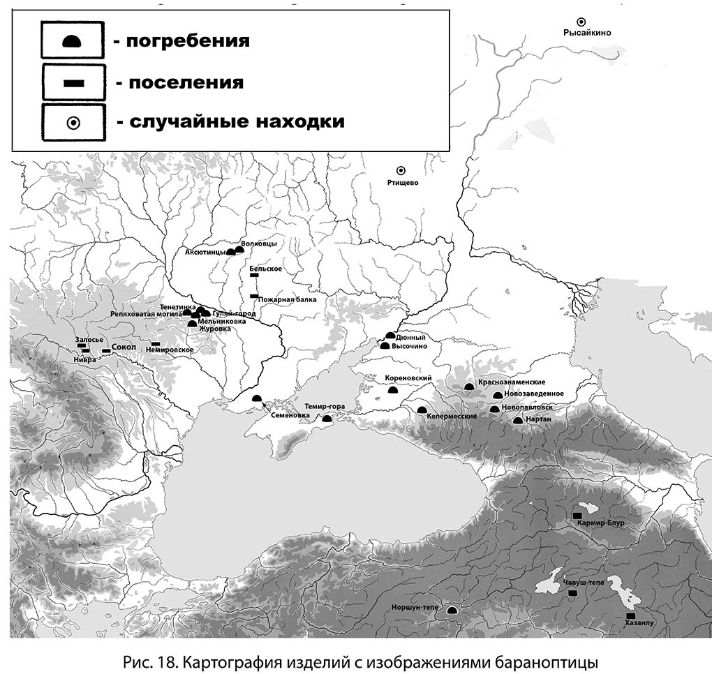 Аналогии и хронология. Предшествующий опыт картографирования изделий и морфологический анализ изображений бараноптицы[129] позволяет утверждать, что мотив бараноптицы возник на Северном Кавказе, развивался и тиражировался в Среднем Поднепровье, Подонцовье и Нижнем Подонье, но распространялся, хотя и в значительно меньшем масштабе, и в других регионах, так или иначе испытывавших влияние скифской культуры (в зоне «савроматской» культуры на границе лесостепного Подонья и Поволжского Правобережья (псалии из Ртищева) и в Самаро-Приуралье (псалий из Рысайкина), а также в регионе скифских походов в Закавказье и Передней Азии - см. псалии из Хасанлу-III и Чавуш-тепе), причем в одних случаях налицо вполне адекватное воплощение образа, в других случаях - искажающее тиражирование.