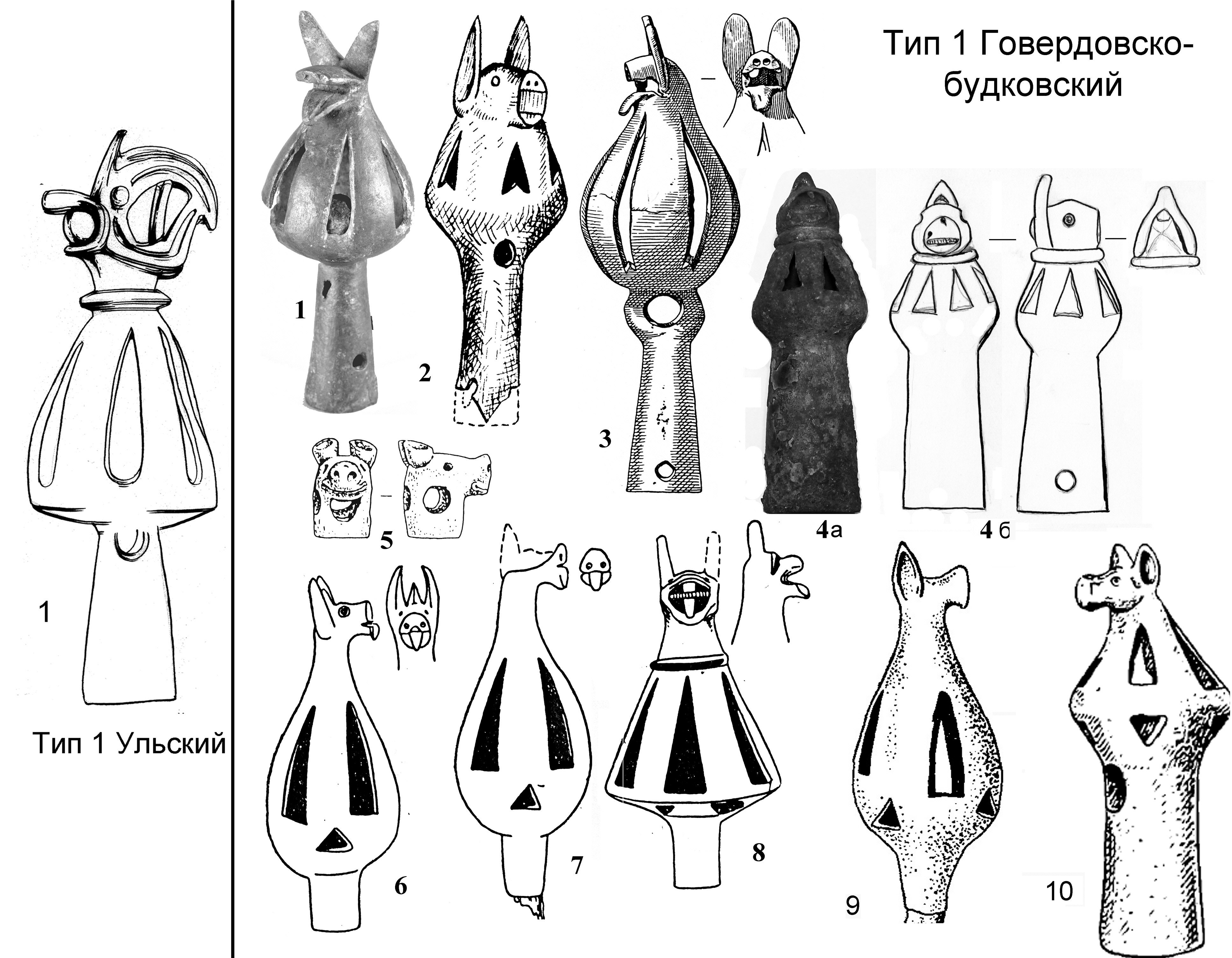 Тип 1 Говердовско-будковский объединяет 10 изображений, происходящих с территории Прикубанья (1-3), Центрального Предкавказья (4, 5), Среднего Поднепровья (8, 9) и Нижнего Поднепровья-Поднестровья (10). В основном эти изображения оформляют бронзовые навершия с бубенцом (1-4, 6-10), и лишь в одном случае – роговые столбики-распределители уздечных ремней (5)[144].