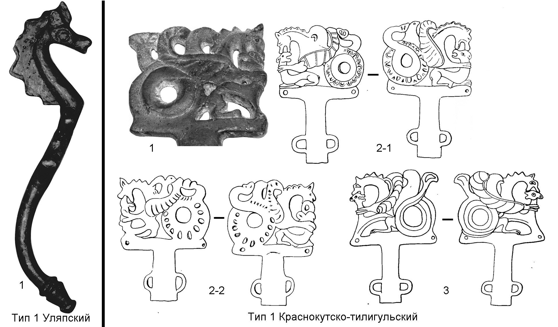 1 – Уляпские курганы, курган 5 (по: Канторович А.Р., Эрлих В.Р. Указ. соч. Кат. 63). Грифоно-гиппокамп. Тип 1 Краснокутско-тилигульский: 1 – находка в районе Тилигульского лимана (по: Островерхов А.С., Охотников С.Б. О некоторых мотивах скифского звериного стиля на памятниках из собрания Одесского археологического музея // Вестник древней истории. № 2. 1989. Рис.4: 4); 2-1, 2-2, 3 - Краснокутский курган (по: Мелюкова А.И. Краснокутский курган. М., 1981. 9: 1 3)
