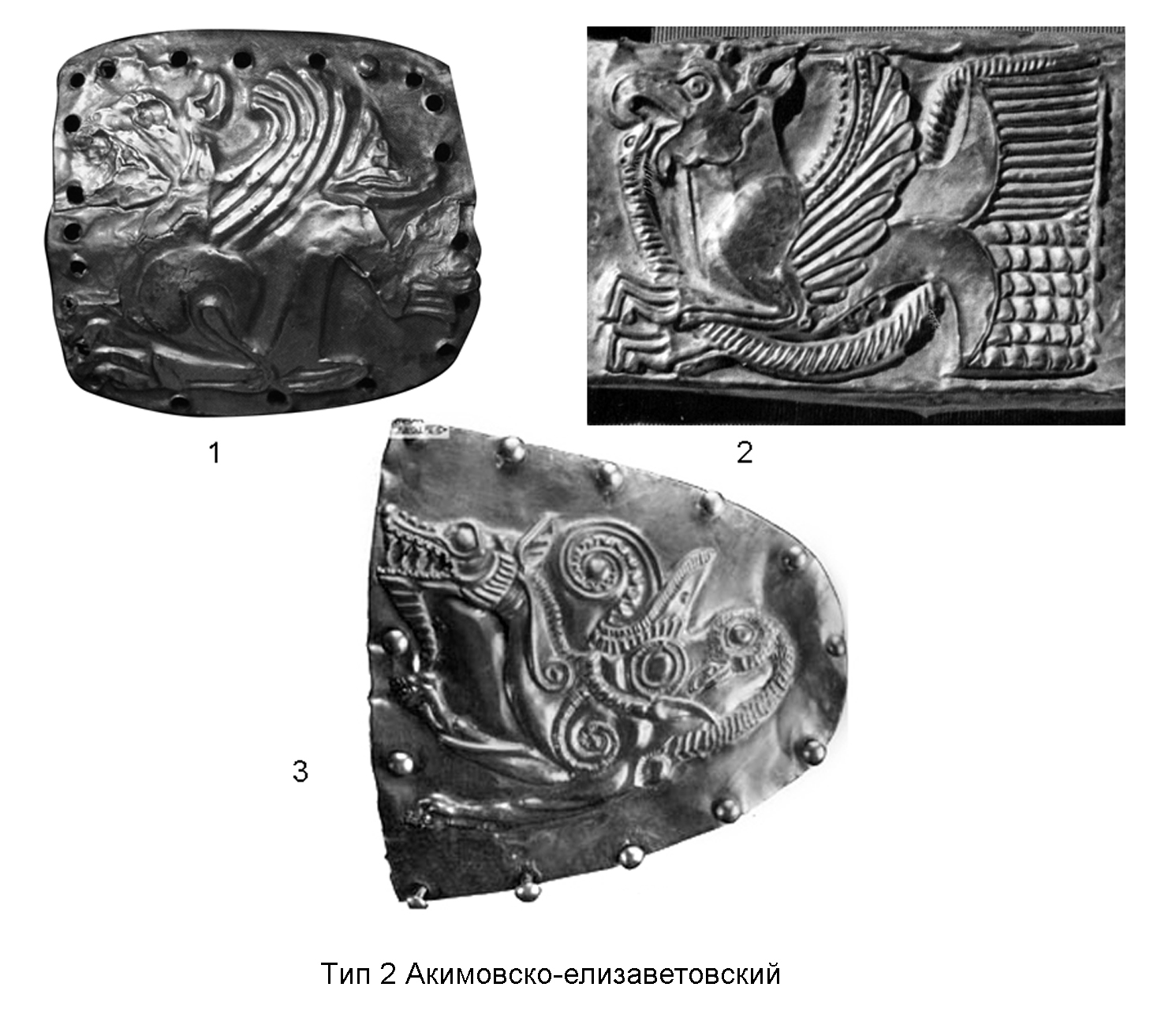 Тип 2 Акимовско-елизаветовский объединяет 3 изображения, происходящие с территории Нижнего Поднепровья (1), Нижнего Подонья (2) и Прикубанья (3). Они оформляют золотые обивки чаши (1) и золотую обкладку ритона (3), а также украшают основную лопасть золотой обкладки ножен меча (2). Изображения моделированы в одностороннем рельефе. Здесь представлено некое существо, состоящее из грифоньей передней части и рыбовидной (1, 2) или змеевидной (3) задней части. Точнее, эти монстры лишены задних ног и наделены в передней части: крыльями, лапами хищника и головой – в одном случае это голова волчьего хищника, но с бородой (3), в двух случаях - голова кошачьего хищника, но с клювовидной верхней челюстью (1, 2). При этом в язык елизаветовского монстра (2) впивается змея (выполненная вполне в греческой манере), обвивающая туловище монстра, проходящая под его животом и затем пропущенная между его лапами (рис. 23).