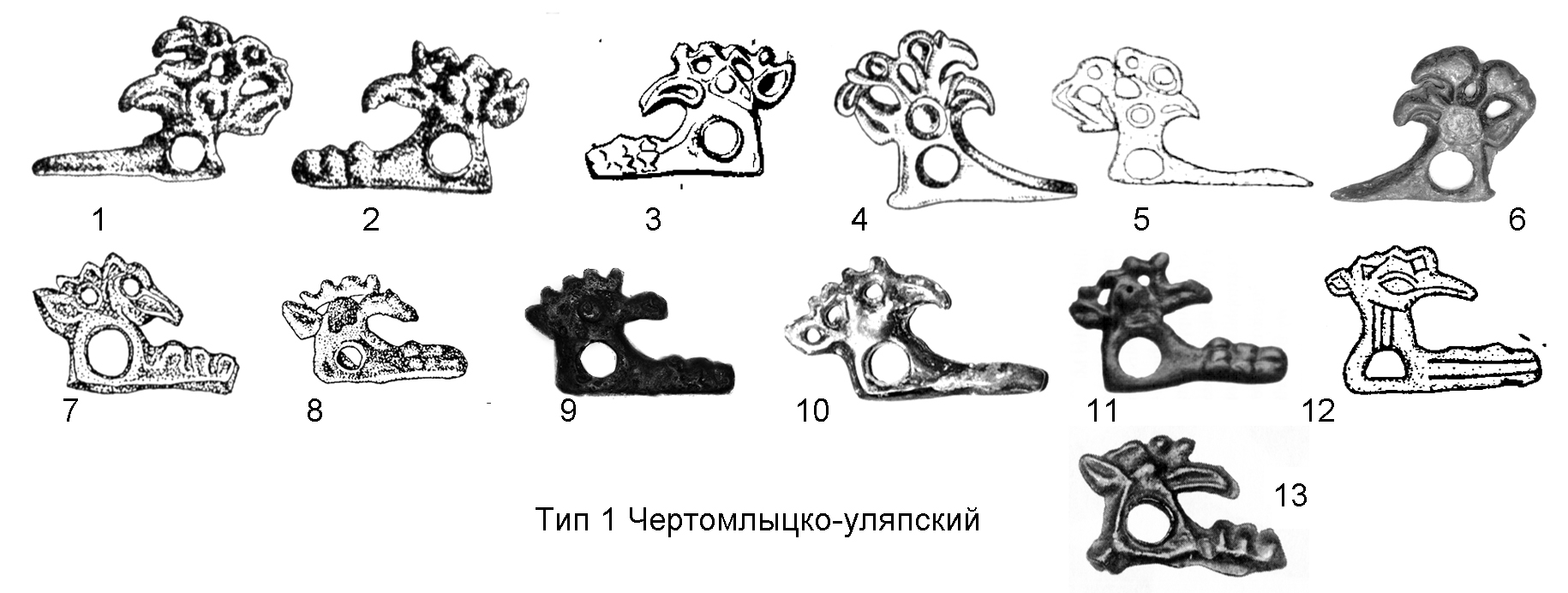 Тип 1 Чертомлыцко-уляпский объединяет 13 оригинальных изображений, оформляющих уздечные бляхи (бронзовые налобники и наносники[170]) происходящих с территории Среднего Поднепровья (4, 5), Нижнего Поднепровья (1, 2[171], 3, 7, 8, 12), Среднего Подонья (9) и Прикубанья (6, 10, 11, 13). Изображения моделированы скульптурно, но рассчитаны на односторонний боковой обзор, соответственно ракурс строго профильный. Голова перпендикулярна шее, параллельна грудной части, ухо противонаправлено клюву, они симметричны друг другу относительно глаза.