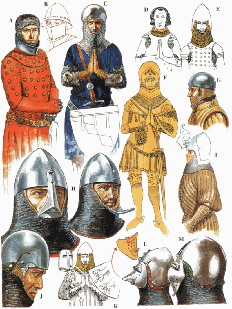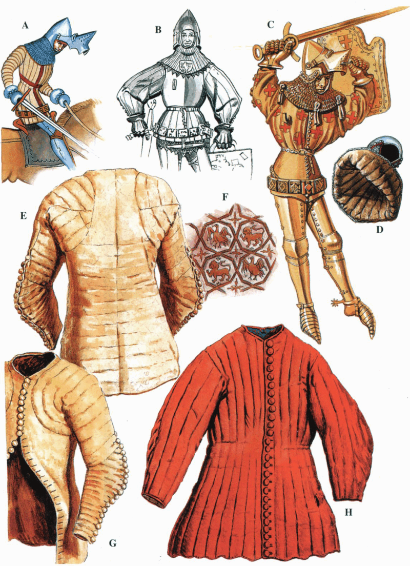 (A) Св. Георгий, из рукописи конца XIV в. стеганый гамбезон, под которым, вероятно, пластинчатые доспехи, придающие воину характерный силуэт «песочных часов». Обратите внимание на кольчужную бармицу, ложащуюся на плечи под углом. Несомненно, под бармицей имеется горжет, иначе бы кольчужное полотно свисало вертикально.