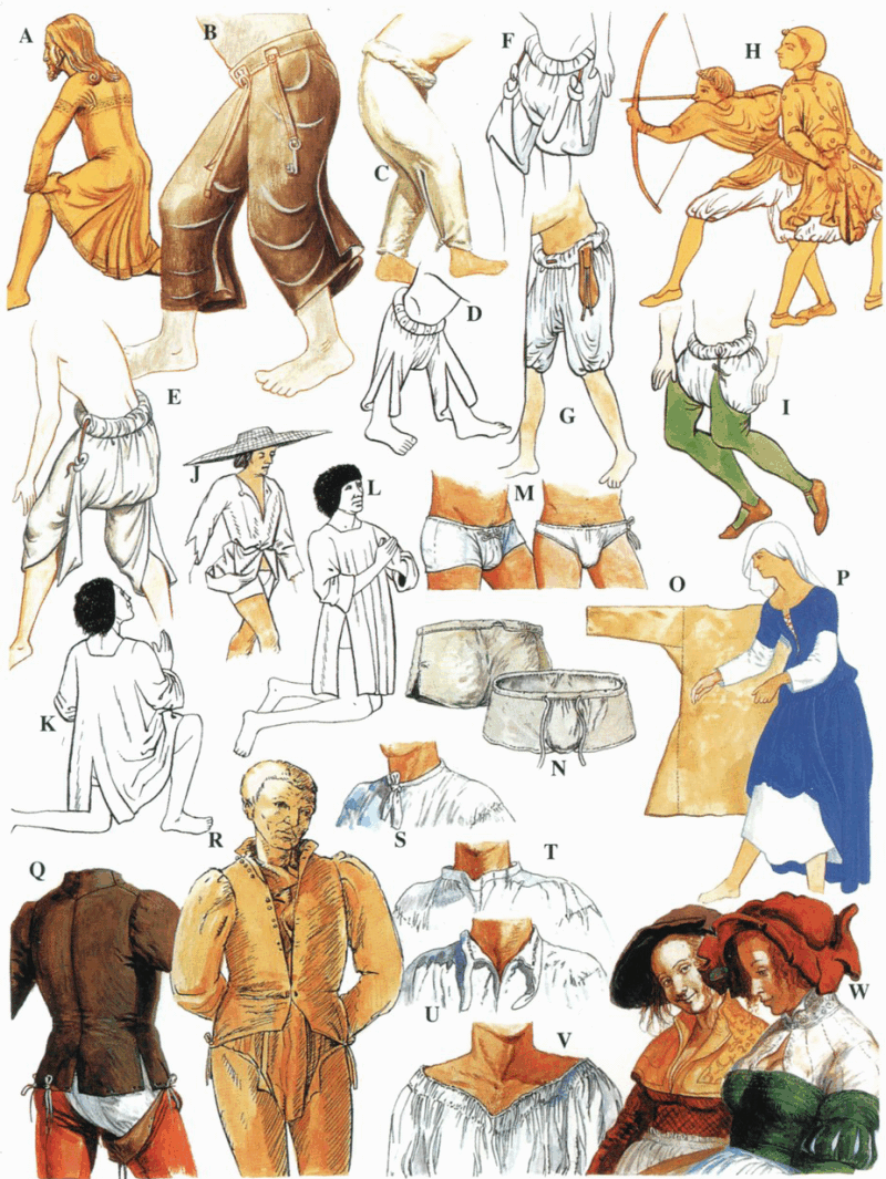 (В-I) Эти иллюстрации из разных источников того периода показывают развитие подштанников. Поначалу подштанники напоминали легкие штаны (В) с разрезами на штанинах, благодаря которым их можно было подогнать по лодыжке (С), подвязать над коленями (Н) или подобрать к поясу (Е и F). Пояс оборачивали вокруг ремня, к подштанникам могли подвешивать кошелек, чтобы скрыть его под одеждой (G). Чулки сначала достигали колен, потом середины бедра, а позднее стали закрывать всю ногу. В последнем случае чулки подвязывали к поясу (I).
