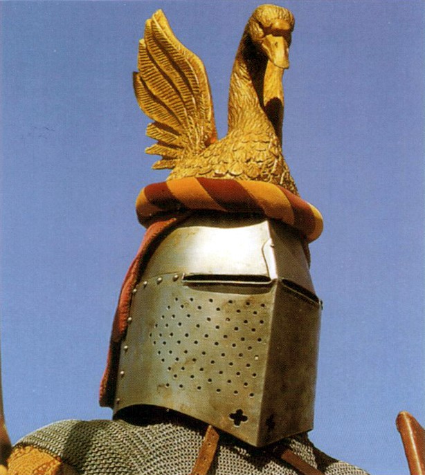 (C) Еще одно изображение св. Георгия как пример рыцаря конца XIV в. Бацинет с «собачьим забралом» (Hundsgugel), бармица доходит до плеч и крепится к нагрудной пластине ремешками. Один сохранившийся до наших дней бацинет с «собачьим забралом» находится в Хурбурге, Тироль. Шлем украшает цитата из Евангелия от Луки: «но Он, пройдя посреди них, удалился» (Лк 4:30).