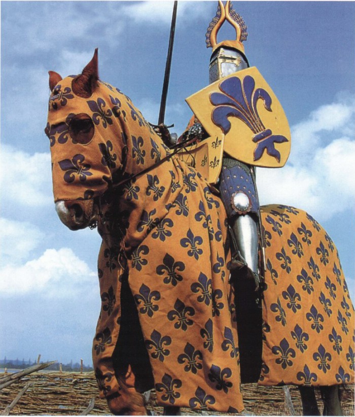 по моде второй половины XIV века. Большие шлемы с турнирными украшениями, полный набор пластинчатых доспехов, частично скрытых под дорогой тканью. Небольшой бацинет носили или под большим шлемом или в качестве самостоятельного шлема. Обратите внимание, что у рыцаря слева на бацинете предусмотрены крепления для забрала. Украшения и демонстрации играли важную роль в военном деле. Они не только помогши определить рыцаря на поле боя и привлечь внимание к его храбрости, но также способствовали распространению славы о нем. Демонстративная роскошь свидетельствовала о богатстве, богатство означало власть, а власть привлекала новых союзников и сторонников, а также отпугивала потенциальных врагов и мятежников. В расходных книгах того времени мы можем прочесть о том, какие огромные суммы уходили на украшения флагов, палаток, и даже парусов кораблей. И с пользовалась вышивка, окраска и аплиикация. В 1352 г. около 330 штандартов было подготовлено для армии Эдуарда III. 250 из них шились из 2,5 ярдов камвольной и 1,5 ярдов льняной ткани. Эти флаги окрашивались киноварью и лазурью. 80 желто-синих полотнищ из камвольной ткани были украшены изображениями львов и лилий. Восемнадцать художников работали в течение 12 дней, еще 50 других мастеров быт заняты почти месяц, обрабатывая полотнища воском. Королевское сюрко в 1345-49 гг. делалось из 1,25 ярда синей и красной такни, а также 1,5 ярда желтой ткани, из которой выкраивались львы и лиши. В 1351-52 гг. 150 лучников короля Эдуарда получили ливреи, для пошива которых 15 портных работали 12 суток, получая ежедневно 4,25 пенса. В 1352 г. Эдуард заказал для себя темно-синий шатер, украшенный звездами и коронами из желтого сукна, а также зеленый шатер с красной подкладкой и желтыми орлами. В 1386 г. во время подготовки Франции и Бургундии вторжения в Англию герцогский художник Мезьхиор Бредерлам расписывав знамена герцогскими гербами, а также украшал паруса десантных кораблей золотыми девизами.