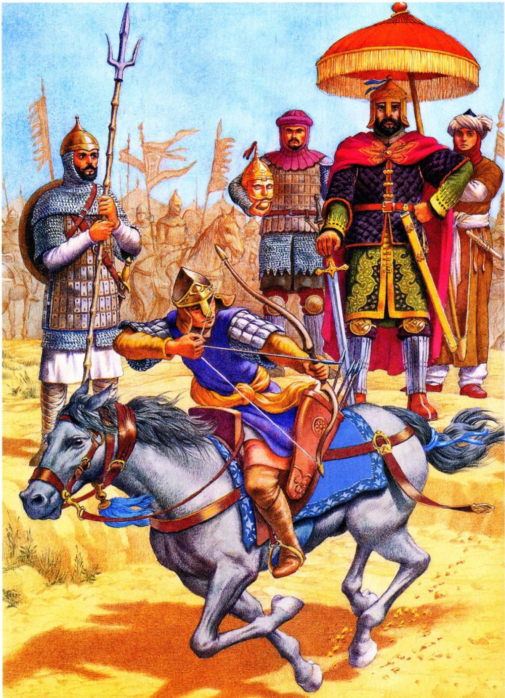 Традиционно армия сельджуков состояла из нескольких контингентов. Профессиональная конница (гуламы), наемники и отряды родоплеменной конницы. Кроме того, в армиях сельджуков имелась и пехота. Тяжеловооруженный пехотинец, вроде того, что изображ ен слева, вооружался большим щитом, копьем или пикой, а также носил кольчугу иногда и пластинчатые доспехи. Средин пехотинцев были также лучники, арбалетчики, а также огнеметчики, вооруженные устройствами для метания греческого огня. Кавалерия сельджуков была легче кавалерии крестоносцев, хотя ее нельзя было назвать легкой. В состав конницы входили гуламы, наемники и ужасные конные лучники-горцы. На иллюстрации изображен такой конный стрелок, умеющий стрелять на полном скаку. Конные лучники применяли тактику «ударил и убежал». Мусульманские армии состояли из полков, которые дальше членились на подразделения разного уровня. Армии крестоносцев огранизовывались по правилам, принятым для средневековой Европы.