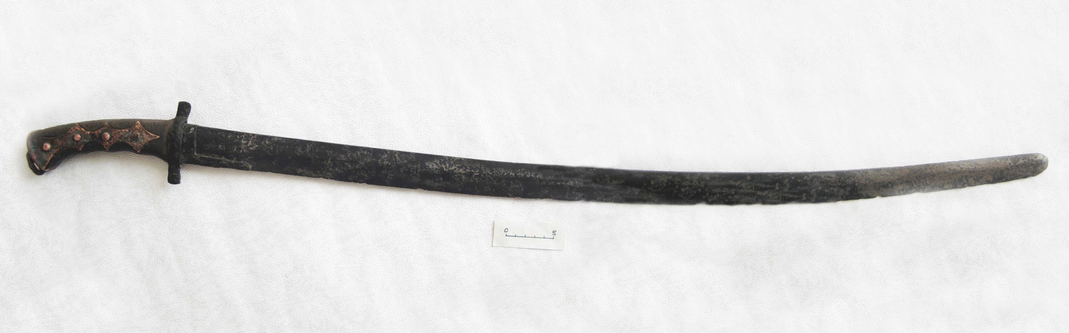 Монголо-татарская сабля XII-XIII веков. Длина – 1000 мм, длина клинка – 860 мм, ширина клинка у основания – 40 мм.