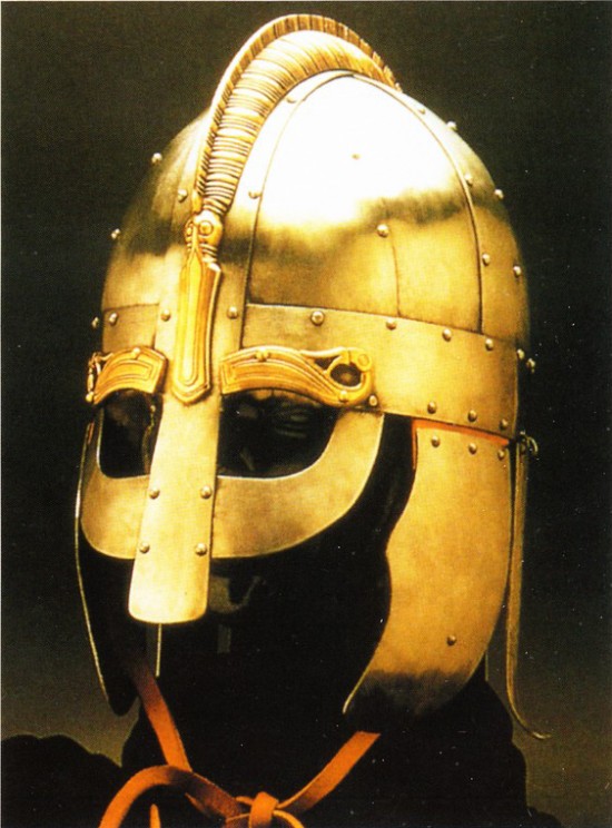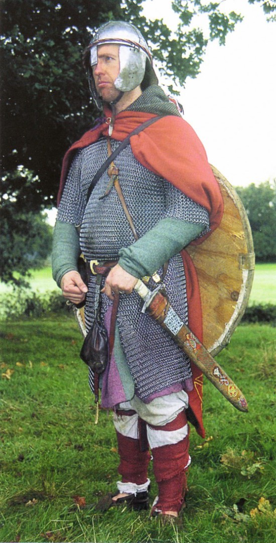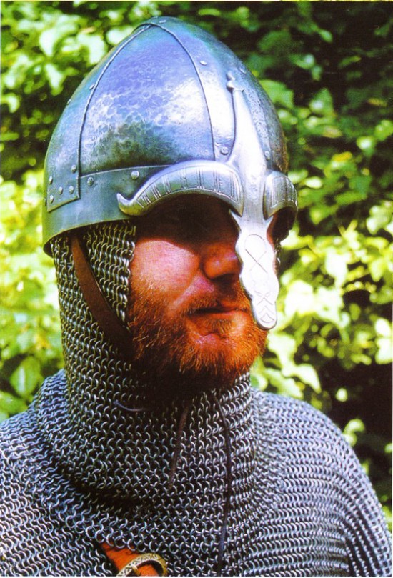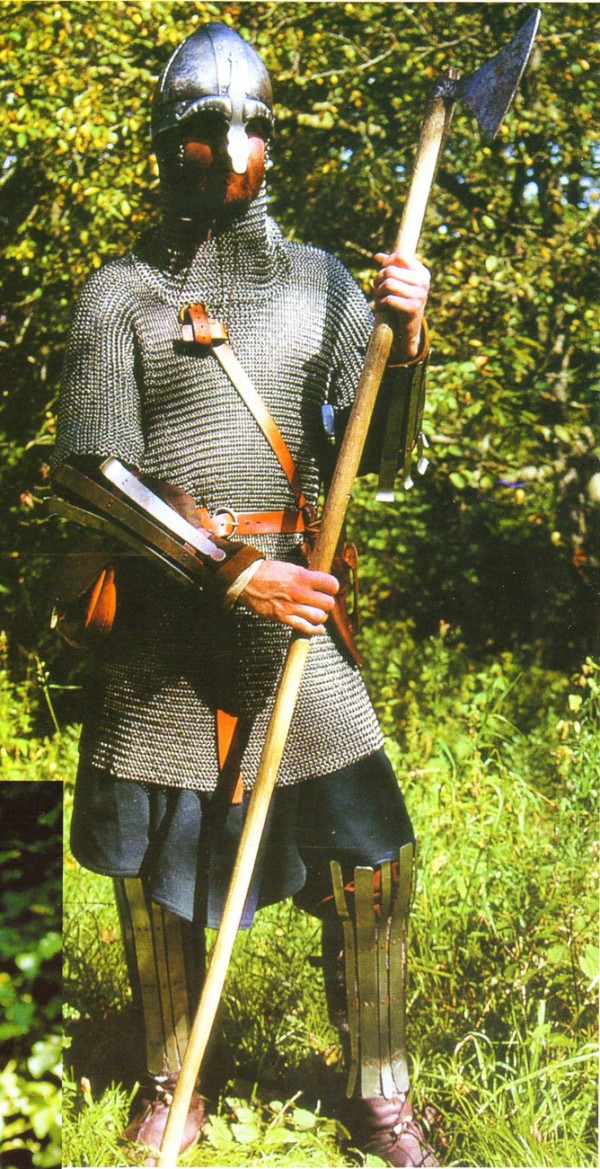 Помимо характерных скандинавских деталей в виде «бровей» и «домино» эта реплика шлема имеет височные пластины. Такие пластины имелись у некоторых известных венделевских шлемов, а также у ранних англо-саксонских шлемов, в том числе обнаруженных в Саттон-Ху и Иорке (коппергейтский шлем). Можно предположить, что такие шлемы еще встречались в VIII-ІХ вв. Другая интересная деталь – назатыльник из металлической пластины. У коппергейтского шлема назатыльник кольчужный. В Византии члены варяжской гвардии были известны своими рыжими волосами и бородами, высоким ростом и склонностью к алкоголю. Но символом варяжского гвардейца стал большой датский топор с полулунной режущей кромкой. Этот гвардеец носит кольчугу, кольчужную бармицу и полосчатые наручи поножи. Кроме топора он вооружен мечом и ножом. В сражении варяги защищали голову шлемом с кольчужным подшлемником. Сегментный шлем с большой декоративной носовой пластиной и «бровями» несомненно нордического происхождения. На рисунках варяги часто изображались в кольчугах, поверх которых имелись лимеллярпые панцири. Обратите внимание на перевязь, идущую через правое плечо. Варяги носили мечи на таких перевязях. Кроме скандинавского оружия варяги могли использовать и сабли византийского образца.