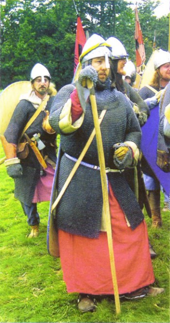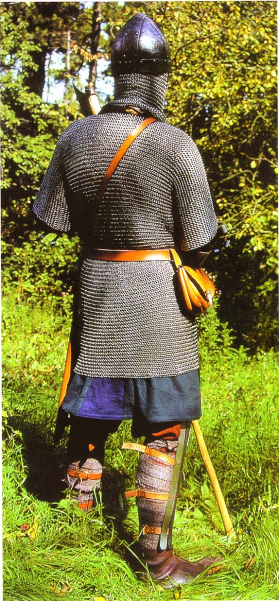 Наручи полосчатой конструкции. Обратите внимание на различную длину металлических полос. Более длинные полосы закрывают локоть. Деревянные ножны у левого бедра обтянуты кожей. Перевязь, на которых висят ножны, пропущена под поясным ремнем. Небольшой кожаный чехол у ножен обычно вмещал ножницы для стрижки бороды и волос на голове. На поясном ремне также носили нож. Вид сзади на варяжского гвардейца. Ремешки поножей застегиваются па икре с помощью пряжки. Под кольчугу поддета шерстяная рубаха, в полу которой вставлен треугольный клин. Небольшие принадлежности хранятся в кожаном подсумке на поясном ремне, застегнутом па костяную пуговицу. В подсумке может быть кремень, кресало и трут, а также ложка и чашка. Из-за своей массы византийские кольчуги делались с сравнительно короткими  рукавами, доходящими лишь до локтя. Здесь вместе с кольчугой воин носит полосчатые наручи и поножи. Поножи собраны из металлических полос, отогнутых у колена и лодыжки, чтобы не ограничивать движение в суставах. Обратите внимание на разную ширину ткани.