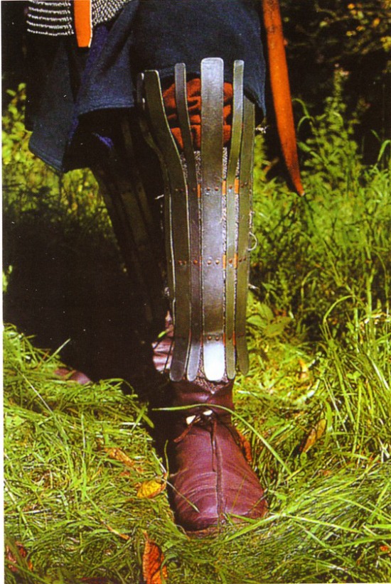 деревянные ножны меча обтануты кожей викинг, вид сзади полосчатые поножи