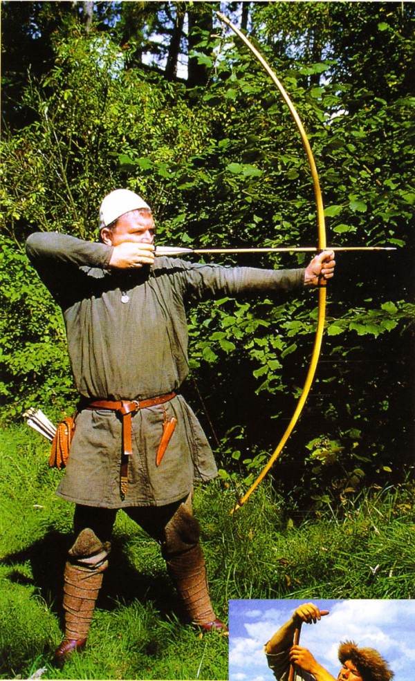 Лучники были «артиллеристами» средневековья. Эффективная дальность стрельбы из лука достигала 200 м. Лук использовался не только для войны, но и для охоты. Луки делали из тиса, ясеня или вяза. Длина лука достигала 1.6 -2 м. Хороший пример варяжского лука обнаружен в Хайтабю. Он вырезан из тиса, имеет длину 1915 мм и силу натяжения 40.8 кг. Аналогичный лук. изготовленный из вяза, обнаружен археологами в том же Хайтабю. Иногда луки оснащали усиливающими накладками из льна, кожи или сухожилий.