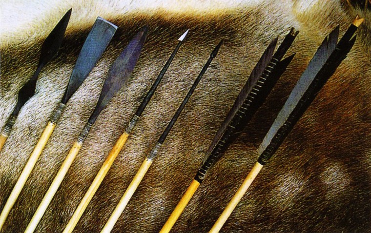 Наконечник мог крениться не только посредством втулки, но и с помощью хвостовика, который втыкался в древко. В любом случае стрелу оперяли, закрепляя оперение клеем из березового дегтя и нитью. Хотя изготовление стрел было обычным занятием воинов па привале, в основном стрелы делили женщины дома. Наконечник мной стрелы имеет крестообразное сечение. Наконечники и оперение стрел. Слева направо: крестовидный в сечении наконечник, показанный на одной из предыдущих фотографий. Два широких плоских наконечника, два шиловидных наконечника, оставляющие глубокие раны и сильное кровотечение. Острые пирамидальные наконечники концентрируют удар на узком участке, что позволяет им пробивать кольчугу. Для охоты на птиц и другую мелкую дичь использовали стрелы с тупым шаровидным наконечником. Одного удара тяжелой стрелы было достаточно, чтобы сбить птицу. Браслеты наподобие этого носили как мужчины, так и женщины. Подобные украшения использовались также в качестве наличных денег. При необходимости их даже рубили на куски. Часто украшения из витой серебряной проволоки дополняли мордами животных. Найдено несколько таких украшений, часто сделанных из комбинации драгоценных металлов: серебра, золота и бронзы.