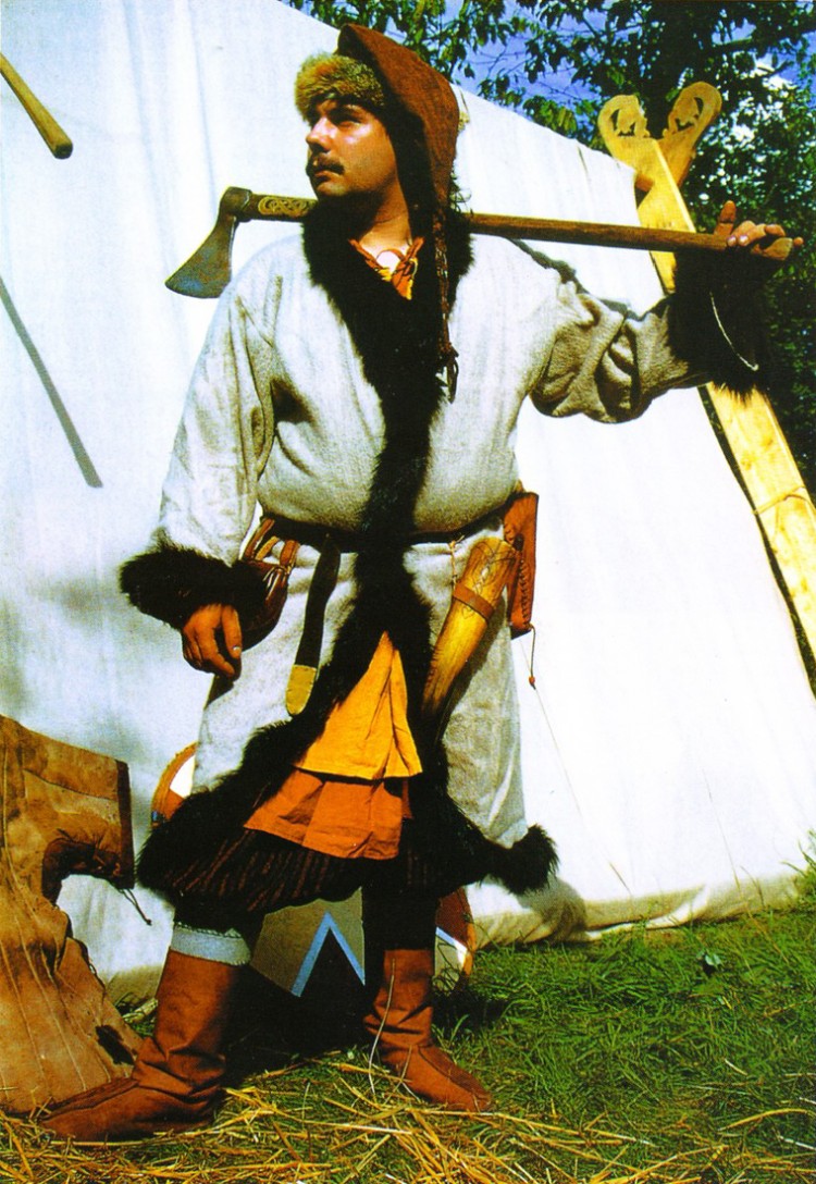 Маршруты передвижения викингов на востоке были длинными и трудными, им приходилось пересекать территории, населенные кочевниками. Купцам приходилось защищать себя самим. Здесь представлен богатый купец. Он носит две рубахи и турецкие шаровары. Льняная нижняя рубаха и верхняя рубаха из фризийского сукна. Обе из тонкой окрашенной пряжи. Кожаная шапка и кафтан оторочены мехом. Украшенный медной инкрустацией топор на длинном топорище служит как инструмент/км, так и оружием. Экипировку довершают украшенный рог и кожаный подсумок. Сапоги, застегивающиеся па кожаные пуговицы, реконструированы в соответствии с находками, сделанными на Ладожском озере и в Хайтабю. Ноги до колен покрыты обмотками. Хотя известны изображения викингов в простых шапках, обычно шапки украшались меховой оторочкой. В Бнрке, центре шведской торговли с востоком, обнаружены фрагменты меха и кожи, которые в свое время вероятно составляли шапки. Кафтан реконструирован по образцам ткани, обнаруженным в Хайтабю, а также по изображениям, в том числе на шлеме из Вальсгарда. Такой кафтан не имел застежек, его носили, перепоясав поясным ремнем.