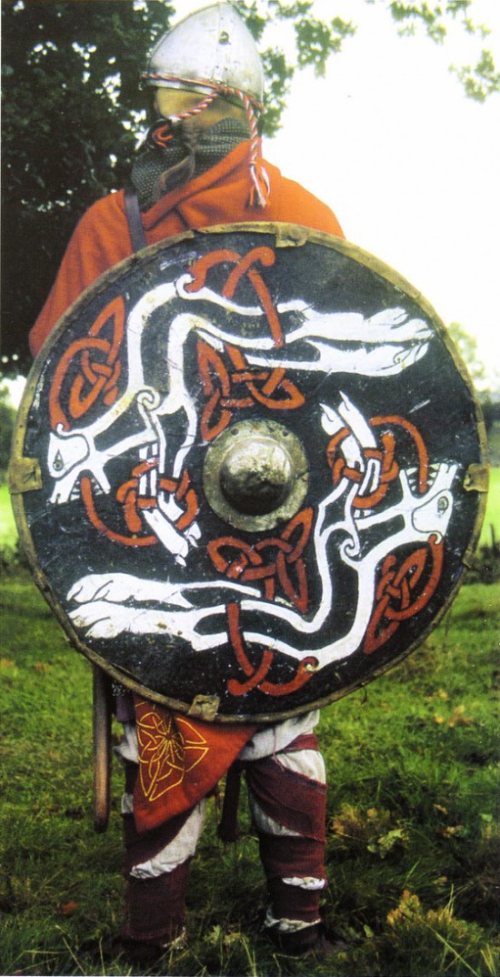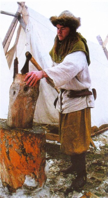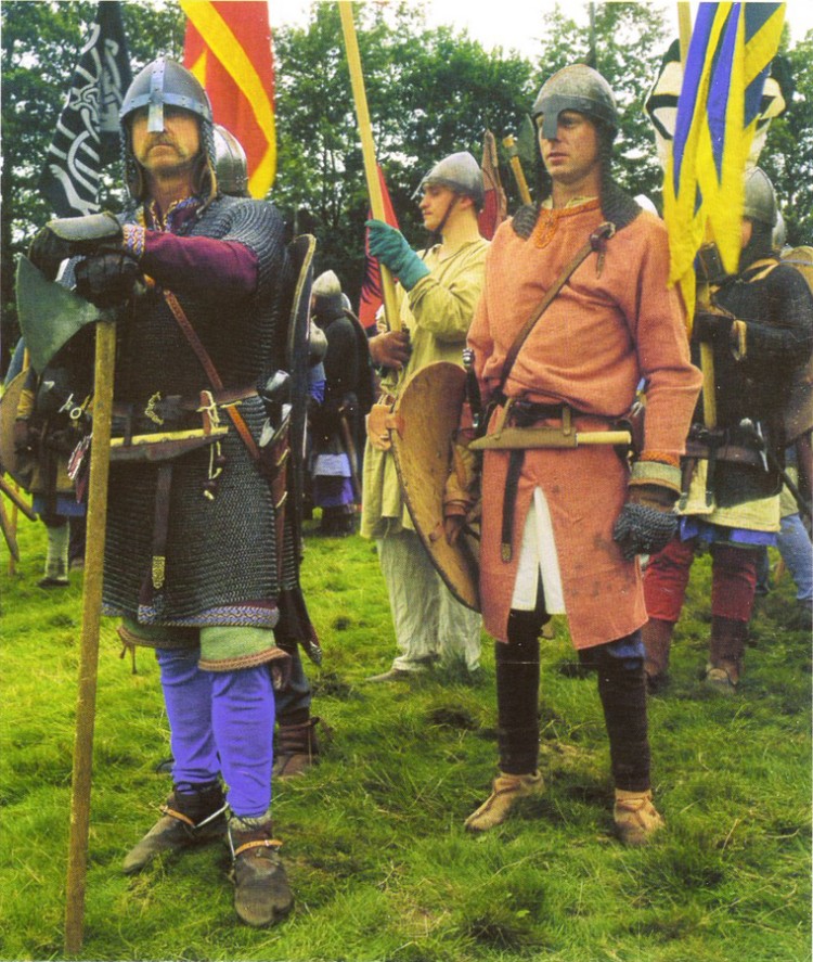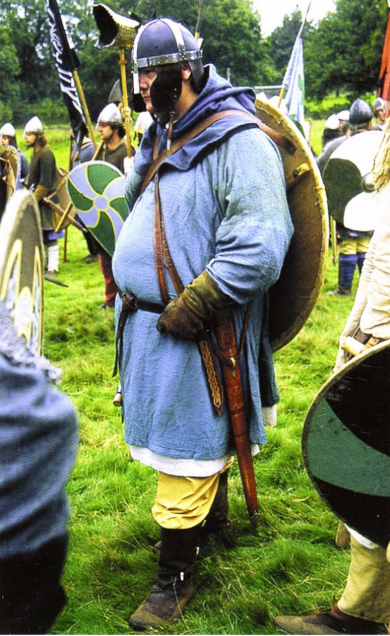 Восточные шаровары, известные и в Скандинавии. Арабы называли викингов «народом в штанах из сотни пядей ткани». Для пошива шаровар требуется огромное количество материи. Нижняя часть штанин окручена обмотками. Обратите внимание на кожаные сапоги, голенища которых застегиваются на пару роговых пуговиц. Менее состоятельный варяг в широких шароварах из грубого сукна менее яркого оттенка. Его войлочная шинка отделана меховой опушкой. В качестве верхней одежды он носит капюшон. Подсумок украшен в стиле Йеллииге, известном декоративном стиле викингов, характеризующемся изображением голов в профиль, спиралями, Н-образпыми формами с декоративными лентами и похожими на ветви выступами. Подсумки наподобие этого, украшенные и нет, разных размеров, обнаруживаются на всех землях, где когда-либо были викинги.