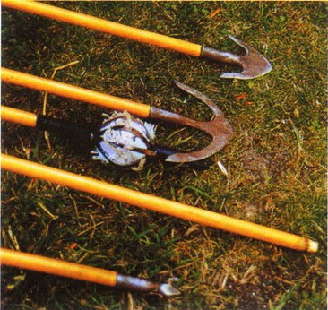 Реконструкция нескольких способов установки тетивы лука. Варяжский лук любил осторожное обращение. Длительное нахождение в сыром месте или под прямыми солнечными лучами ослабляло лук. Эта группа лучников готовится к бою. Каждый воткнул перед собой в землю несколько стрел, чтобы стрелять как можно быстрее. Обратите внимание па простую одежду н дополни тел ьное оружие. Три наконечники стрелы, крепящиеся к древку посредством втулки. Два верхних наконечника имеют бородку, что делает невозможным извлечение стрелы из раны, не причинив жертве дополнительные мучения. Внизу зажигательная стрела, наполненная промасленной пенькой. Зажигательную стрелу поджигали непосредственно перед выстрелом. Нет прямых доказательств того, что викинги использовали дополнительные приспособления при стрельбе из лука. Но можно предположишь, что натягивать 40-кг лук было настоящей пыткой даже для опытных лучников с мозолистыми пальцами.