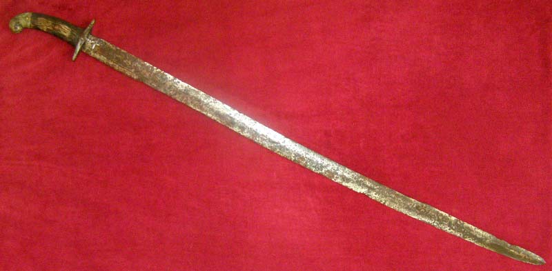 Боевой меч, Гунны. 5-6 век. Длина  – 800 мм, клинок – 640 мм, ширина у основания – 50 мм. Меч находится в прекрасной сохранности. Он обоюдоострый, предназначенный для нанесения колющих ударов.